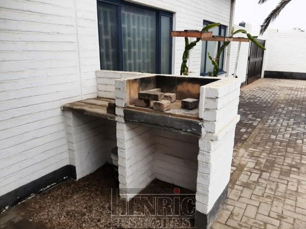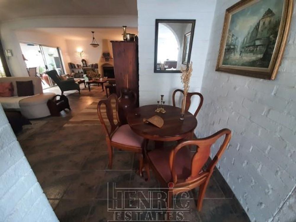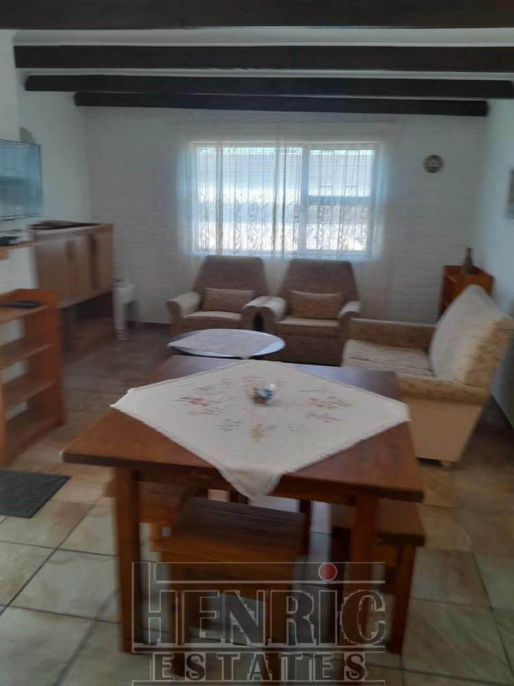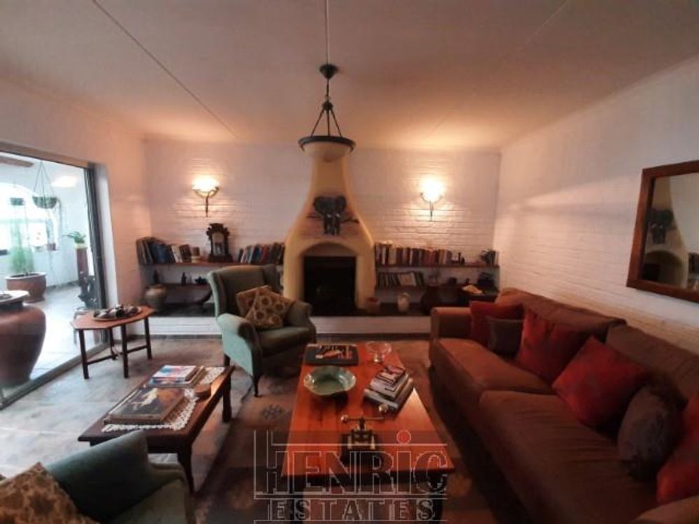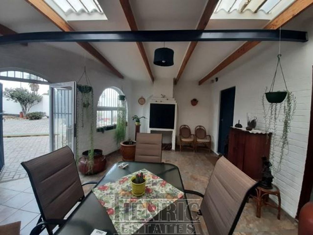 The open-plan dining and living room boasts a built-in fireplace, creating a warm and inviting atmosphere. A sunroom with a built-in braai offers a versatile space for relaxation and entertainment. The main house includes three spacious bedrooms and one well-appointed bathroom. Outside, there is an extra-large double garage providing secure parking and storage space. Additionally, an outside servant's toilet adds to the convenience.