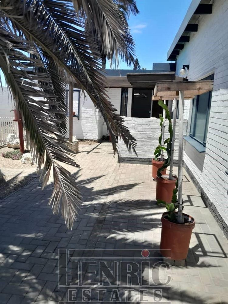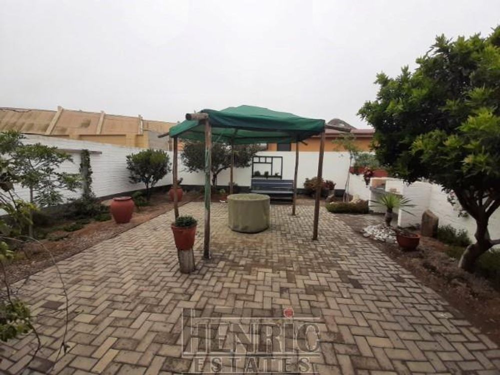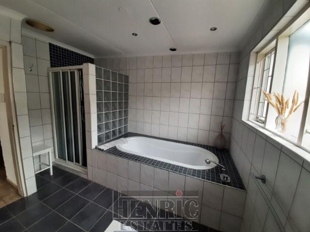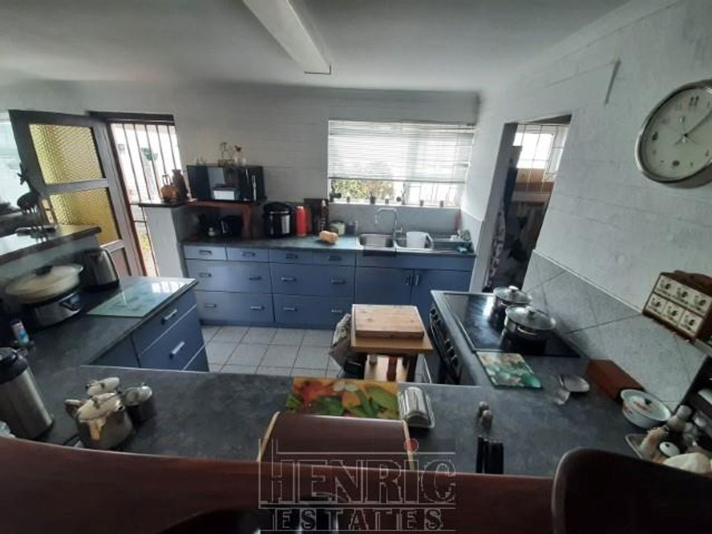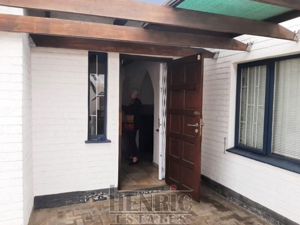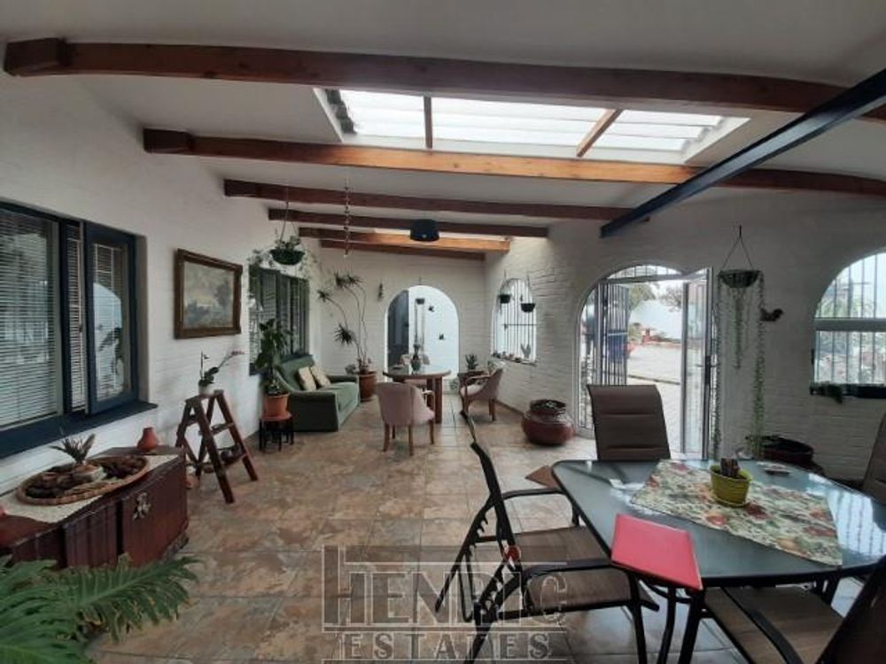 The open-plan dining and living room boasts a built-in fireplace, creating a warm and inviting atmosphere. A sunroom with a built-in braai offers a versatile space for relaxation and entertainment. The main house includes three spacious bedrooms and one well-appointed bathroom. Outside, there is an extra-large double garage providing secure parking and storage space. Additionally, an outside servant's toilet adds to the convenience.