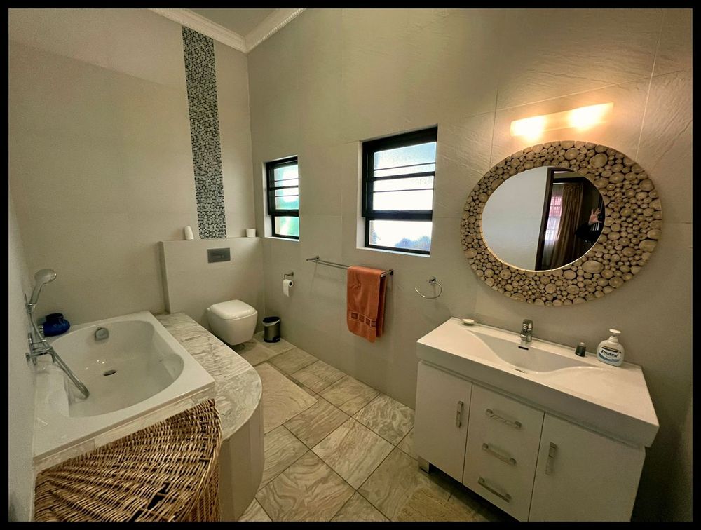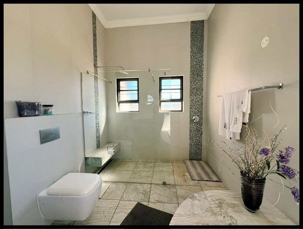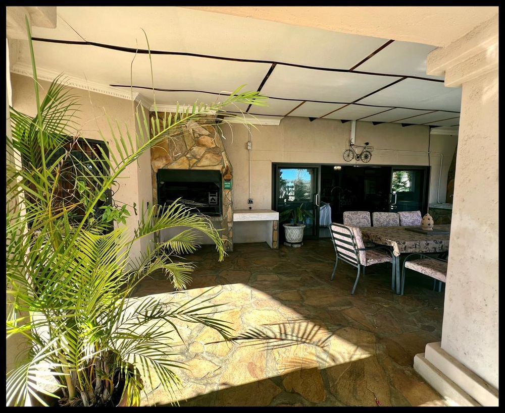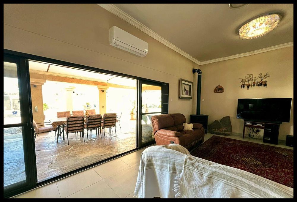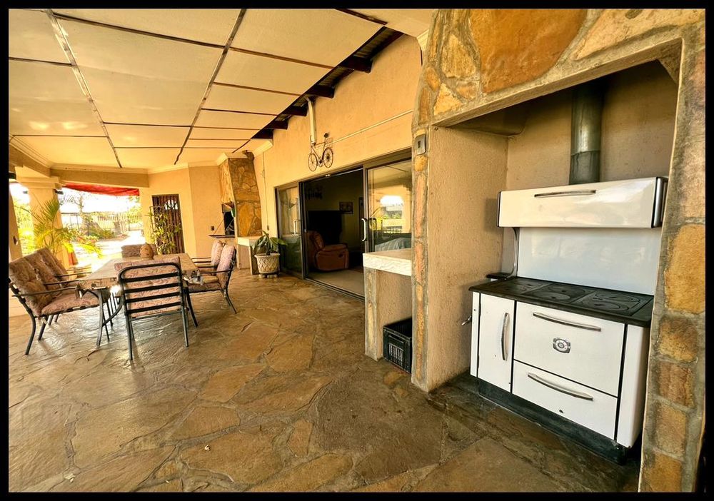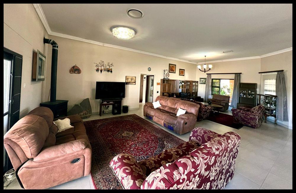 This modern 3-bedroom house has a huge open plan living area with a kitchen to die for with a dining room, lounge, tv room, all opening on to an outside entertainment area with braai etc., there is an office and hobby room as well as a granny flat with separate patio and entrance. The underfloor heating, water cooling system. state of the art solar energy installation with a backup generator, the grey water system for gardening, registered borehole as well as access to municipal water and numerous outbuildings makes this value for money and basically self-sustained living.