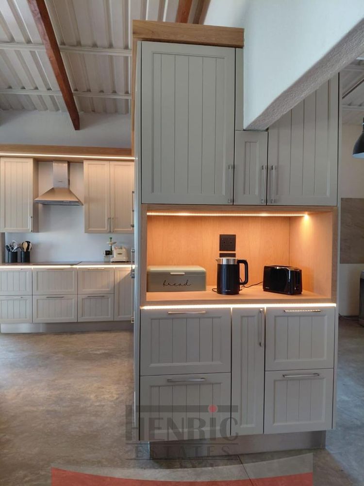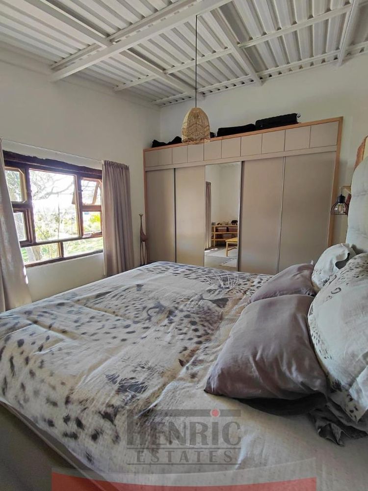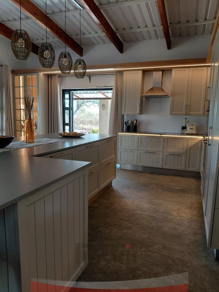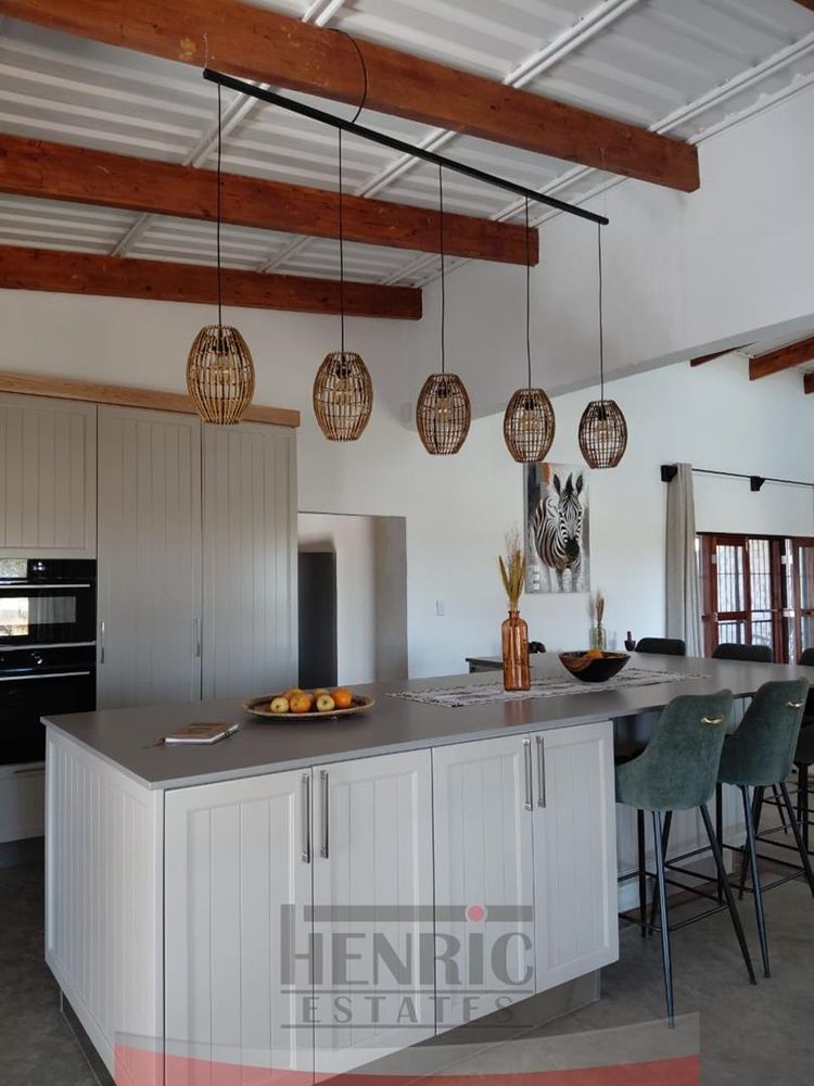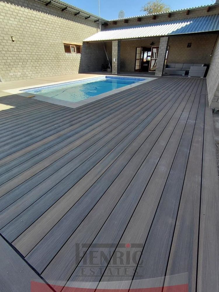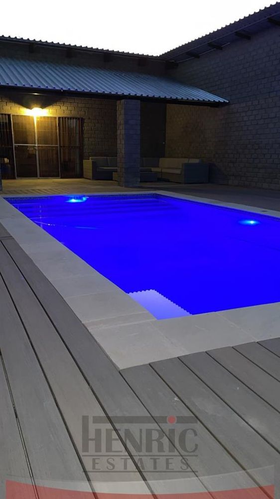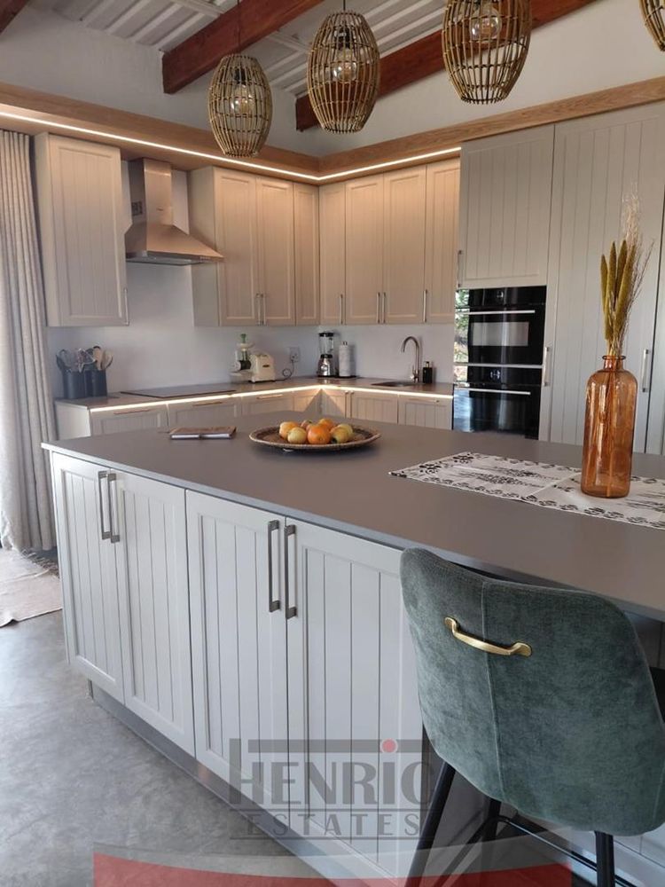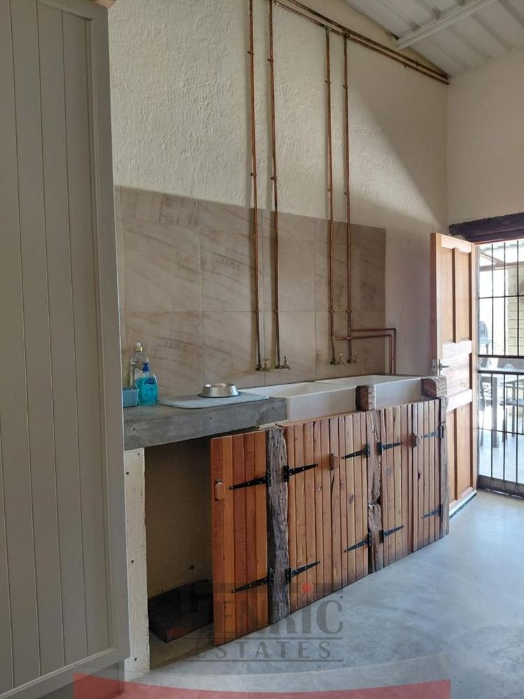 The kitchen is a modern masterpiece, boasting a brand new design with a sleek, large island at its center and an expansive scullery. It seamlessly opens onto an extensive L-shaped verandah that wraps around the house from the kitchen to the main entrance. This outdoor space is perfect for entertaining, leading to a beautifully landscaped garden with a braai area, sunken fire pit, and a tranquil fountain. Additionally, the lounge extends onto a wooden patio featuring a refreshing swimming pool.