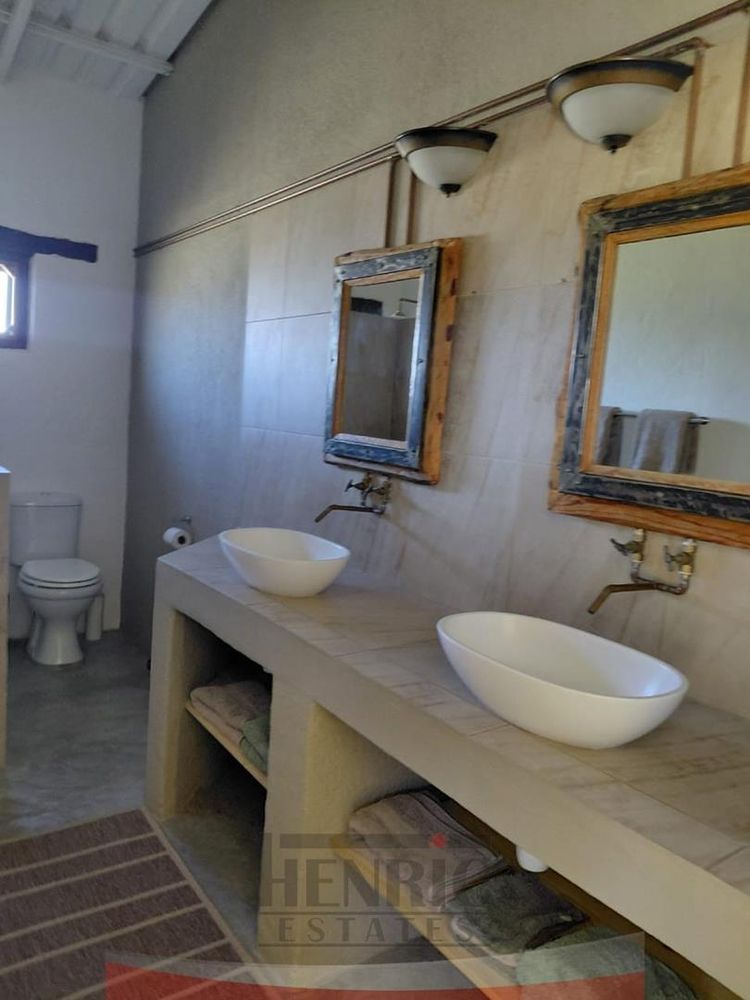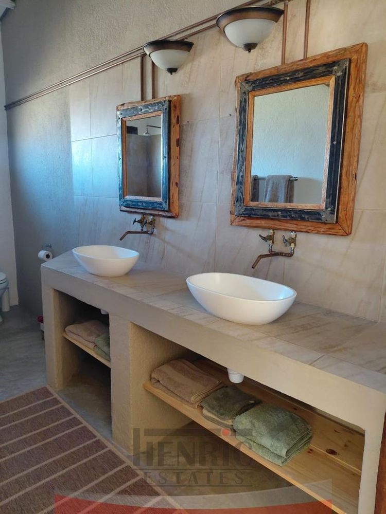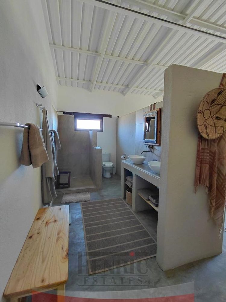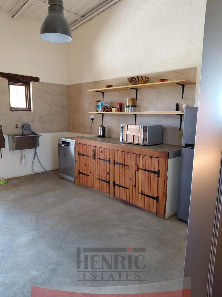 The rustic yet elegant house features three bedrooms and two bathrooms. An additional bedroom with an en-suite is currently being completed. Each bedroom offers stunning vistas of the surrounding landscape. The home exudes charm with its high ceilings, exposed roof trusses, and the use of sleeper wood for door and window frames, complemented by polished cement floors.