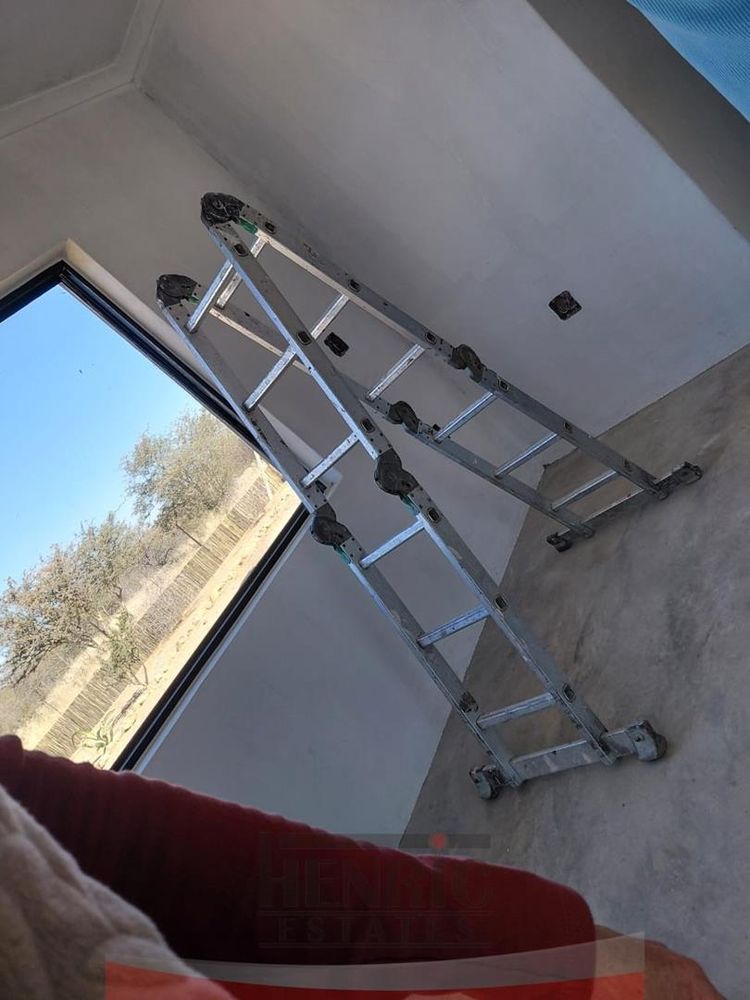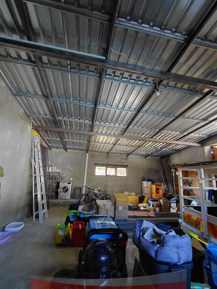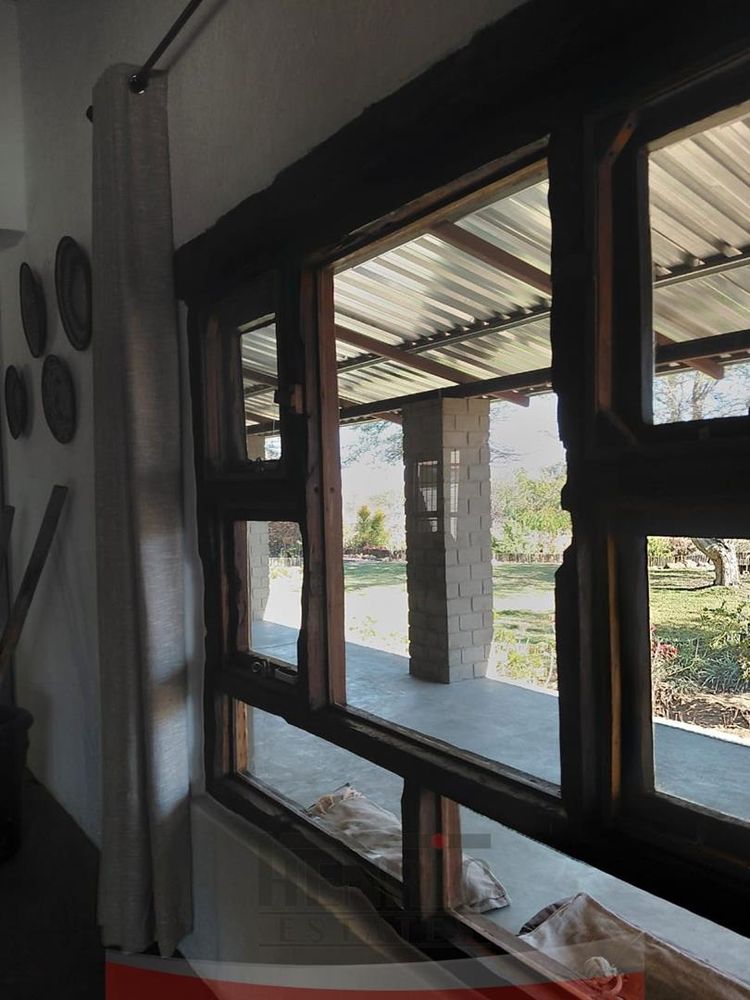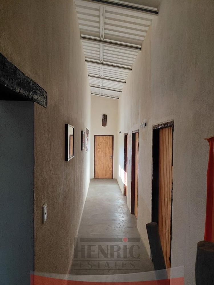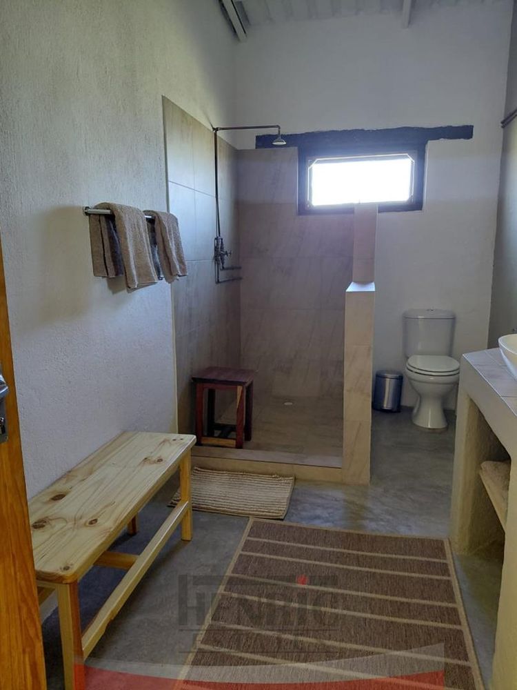 The rustic yet elegant house features three bedrooms and two bathrooms. An additional bedroom with an en-suite is currently being completed. Each bedroom offers stunning vistas of the surrounding landscape. The home exudes charm with its high ceilings, exposed roof trusses, and the use of sleeper wood for door and window frames, complemented by polished cement floors.
