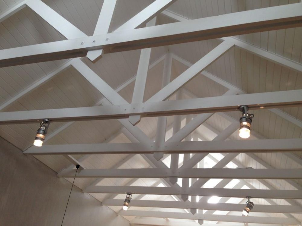 Open roof structure with light fittings attached to the timber beams of the roof structure